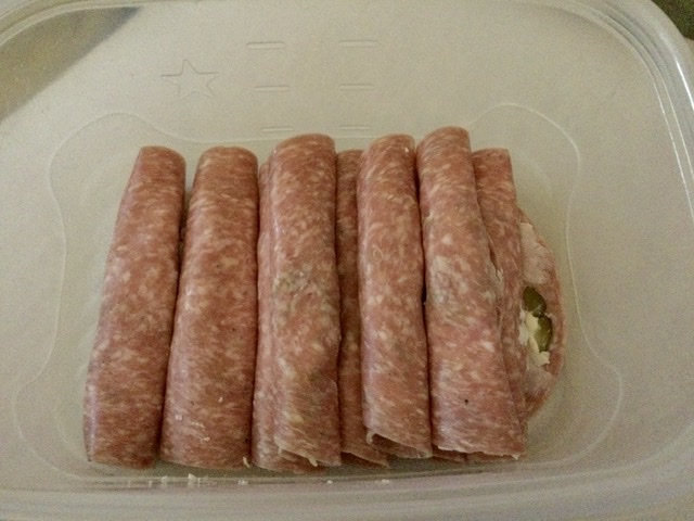 The other day I made salami rolls as my protein snack. A 1/2 lb of genoa salami makes about 20 or so. I diced up small dill pickles and let them drain on paper towels. I spread softened cream cheese on the salami slices, sprinkle them with the diced pickles and roll them up. I used an 8 oz block of cream cheese. They are great to take to a potluck too.