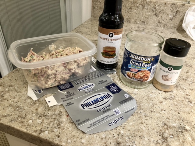 This is what I used, mixed it all together and it is chilling in the fridge. You can double it and use a 3-4 slices of the dried beef to wrap around the ball. Then it won't dry out when you take it to a party. I prefer it on Original Ritz Crackers or the Light Salt Ritz Crackers.