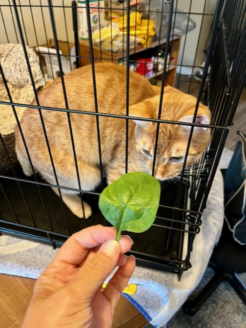 She’s doing a good job isolating from me. I’ve been helping keep her kitten, Banjo entertained. I give him a piece of spinach every day. He’s in a crate when he’s inside because I’m allergic to cats. But we built him a room in the garage where he has to live.