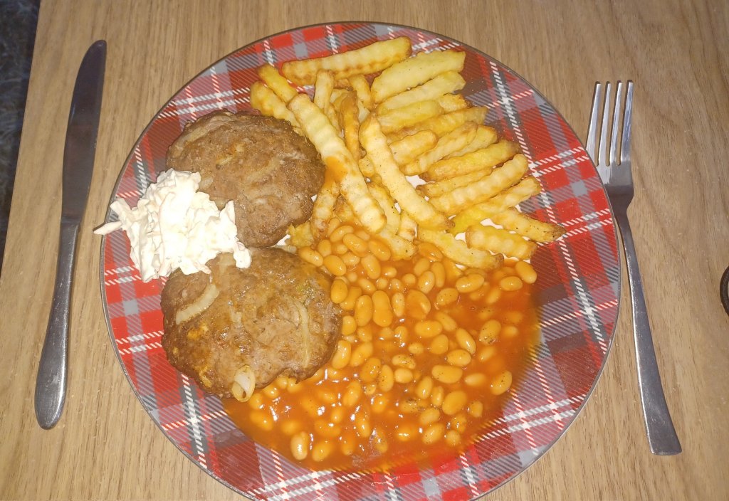 I made my burgers tonight, they were really good! This is how I always serve them, controversial I know, but no bun! With oven chips and baked beans! I think its because i like to eat my dinner with a knife and fork! And a dob of coleslaw. Burgers were made with mince beef, breadcrumbs, onion, jalapeños, paprika, cumin, egg and seasoning.