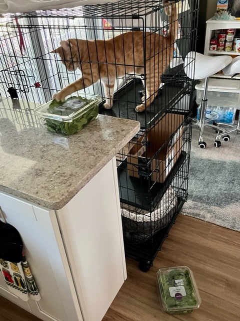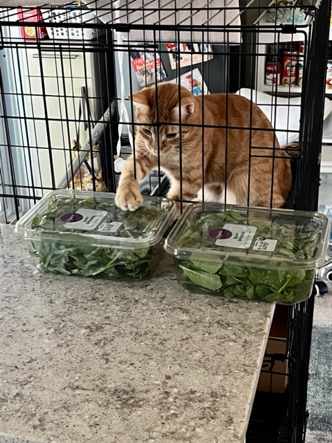 Banjo, my grand-kitty, has a new catio. I can roll him to the door of the lanai to watch squirrels and he can watch me cook. He likes spinach and we now have 4 boxes. So most of it will have to be cooked. I’ll save some raw leaves for him. He inspected the boxes and tossed them to the floor.