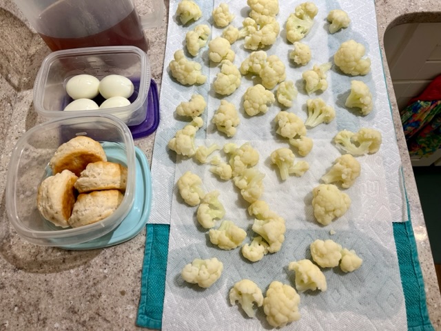 This morning I blanched the cauliflower, now it’s drying so it can go in the freezer. Made biscuits and boiled some eggs.