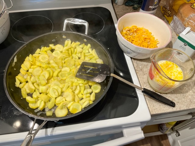 I added a tablespoon of diced garlic to the squash & onion in the skillet. The onions were from my garden. Even tho I added the 1/4 cup water, there wasn’t any juice to drain. But I didn’t cook it to death either.