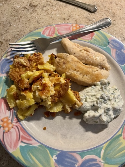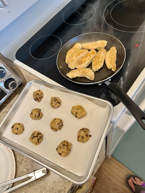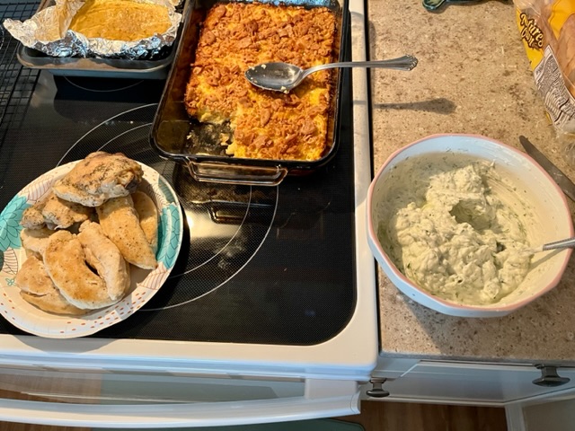 My oldest made baked chicken thighs and tzatziki. I sautéed chicken tenders.