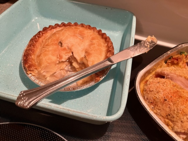 The apple pie was a bit doughy in the center. I warmed it in the oven to dry it out a bit. The filling is good and the crust that is flaky is good too.