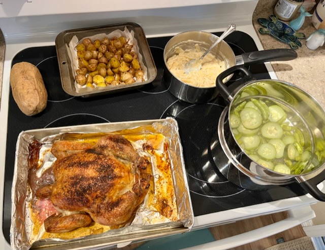 Whole chickens were on sale so we had one roasted in the air fryer with mashed potatoes, gravy and sautéed spinach. Herbal tea and snickerdoodles for dessert.
