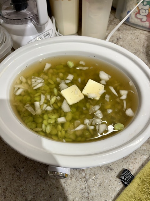 Decided to run the crockpots today. Green beans with onion, peppercorns, kosher salt, minced garlic, parsley all in a vegetable broth. Lima beans with onion, minced garlic, kosher salt and pepper also in vegetable broth.