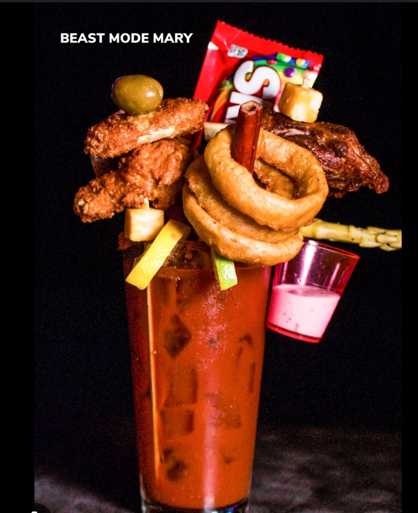 I often see photos of various restaurant's Bloody Mary on Instagram. The drinks have strips of bacon, long string cheese, celery strips, etc. hanging on the glass. Then cheese cubes, olives, lime slices on toothpicks sticking out of the top.