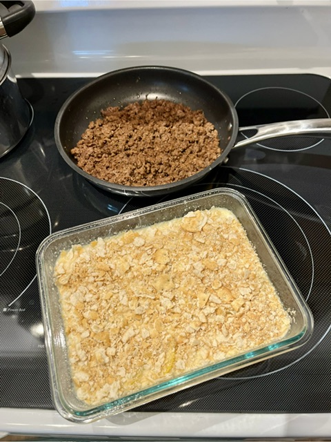 I used Cream of Chicken soup, powdered spices (onion, garlic, salt, pepper). I added a small pack of crumbled Ritz crackers into the mix and used 2 cups of Colby Jack cheese. Then I crumbled another small pack of Ritz crackers for a topping.