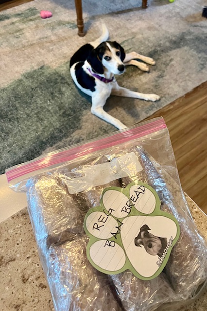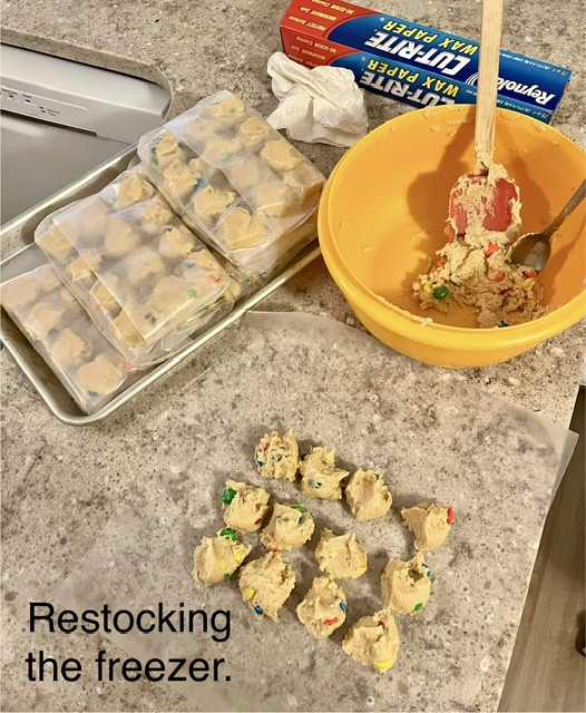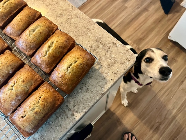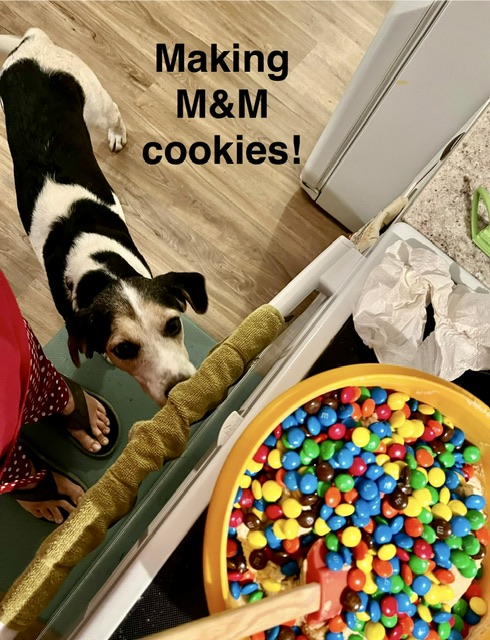 It was a dreary, stormy, sloppy morning here in SWFL. New foster pup Elvis & I did some baking this morning. It was time to restock the freezer. M&M cookie dough & banana bread.