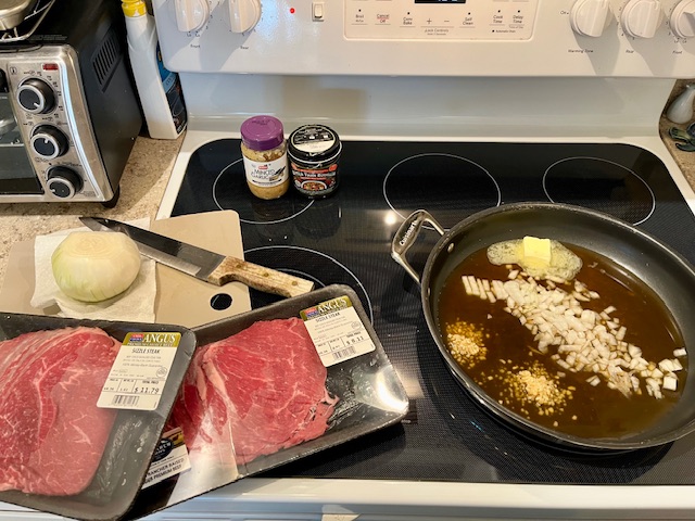 Anyway, I added butter, garlic, onion, salt & pepper. I brought that to a boil, then added the slices. I cooked them maybe a minute, turning once. I put them and the broth in the fridge.
