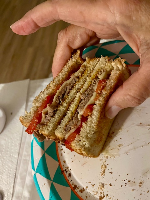 For dinner I made a sandwich. I cut up a slice, melted cheese on it, toasted the bread, added sliced tomatoes and mustard. It was good! I will put the beef on top of a salad also.