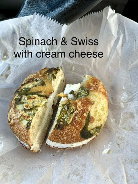 I had to take my laptop in for repair last week. Next to the computer shop was a bagel place. I had never heard of some of the flavors they had. I ordered a toasted Spinach & Swiss with plain cream cheese. It was amazing. I could not eat the whole thing. I had the second half for dinner. It was good chilled too.