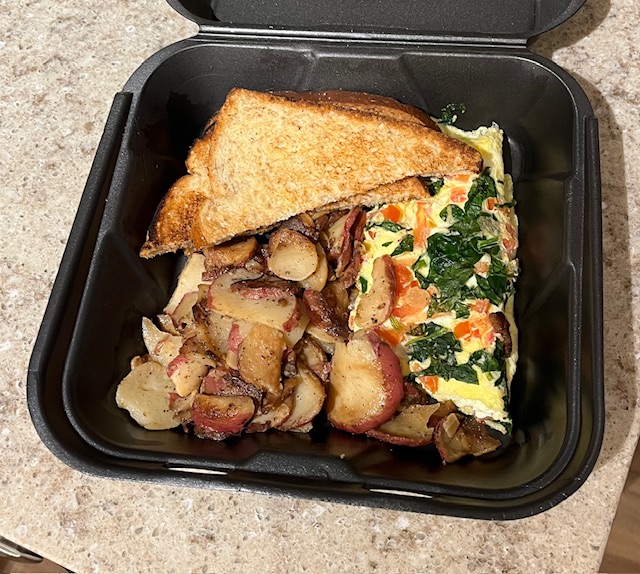 Breakfast with my friend today at KeKe’s Cafe. They put too much pepper on the potatoes. I was able to eat about 1/4 of my Greek omelette, a triangle of toast and a few potatoes. I’m going to sauté the potatoes in butter tomorrow and that should dilute the pepper. I have enough left over for 2 meals!