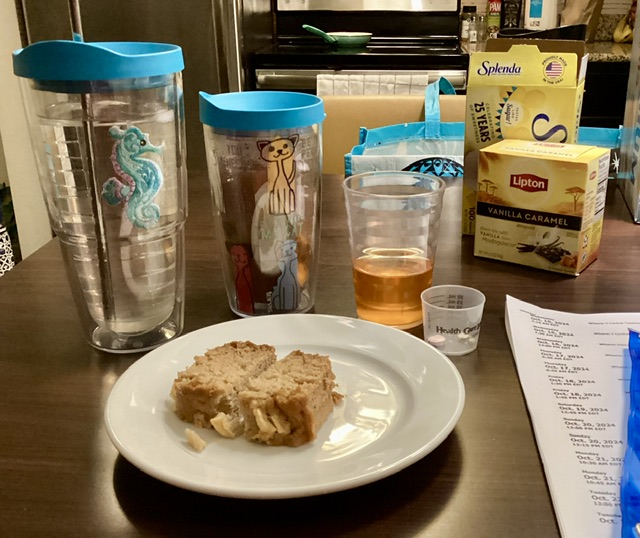 Here’s my bedtime snack: water, hot tea, apple bread & meds!