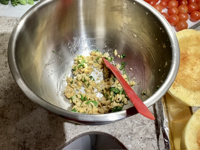 I cannot have pine nuts therefore traditional pesto wasn’t an option. My friend suggested substituting chickpeas. So I smashed about a 1/2 to 3/4 cup of chickpeas with a fork. I added 2 tablespoons of minced garlic, 2 tablespoons of olive oil and snipped a bunch of basil off my plant. That was my “pesto” to coat the tomatoes.