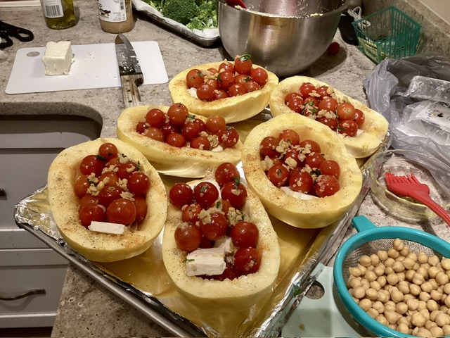 I don’t have red pepper flakes. So I sprinkled paprika, Kosher salt, & black pepper on the squash. When it came out of the oven we sprinkled Parmesan Cheese on them. It was phenomenal. You could not taste the chickpeas at all. We are all spaghetti squash converts now.