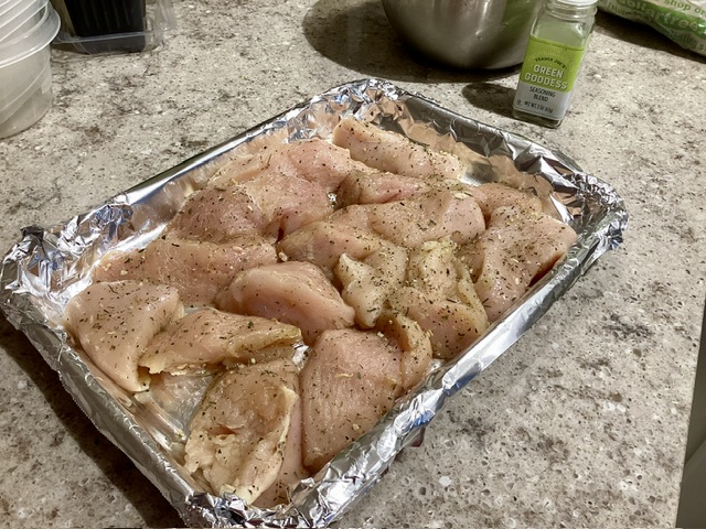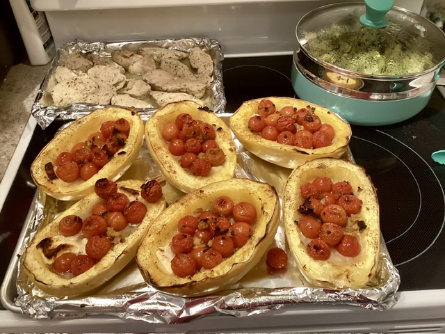 I baked Green Goddess Chicken breast. I steamed broccoli. We made individual casserole dishes and blended the chicken and broccoli in with the shredded spaghetti squash. I didn’t put broccoli in mine and Kiddo didn’t put chicken in hers.