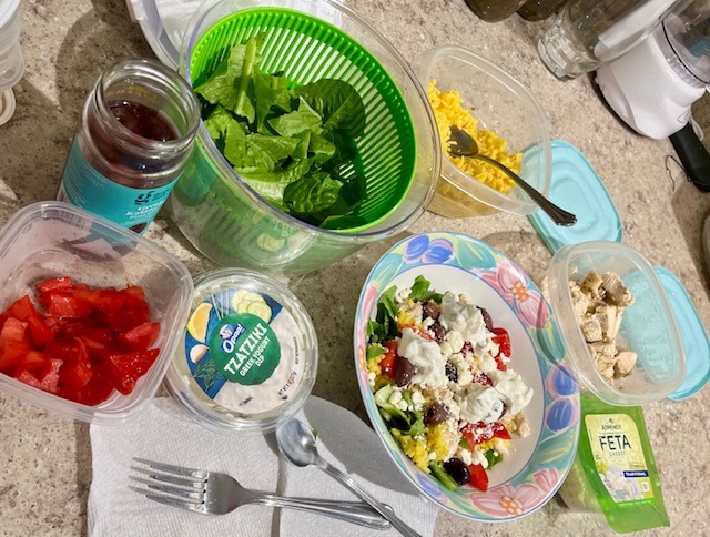 Today was a Mediterranean kinda, salad like you can get at Cava. I picked Romaine from my garden and played with my new salad spinner. I sautéed chicken breast, made yellow rice, diced tomatoes, added Greek olives, feta cheese and tzatziki.