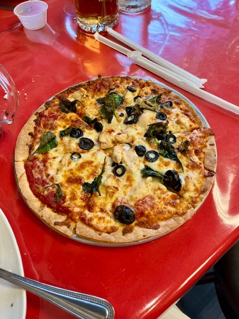So we went to Ramano’s for dinner. I had a 10” Mediterranean Pizza and a Greek salad. It was delicious! I have 1/2 a pizza left.