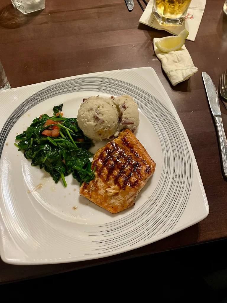 I had salmon with mashed red potatoes (didn’t like them) and spinach. I got apple pie to go. They got cheesecake to go. I took a bite of the pie and it is ungodly sweet. So it’s in the fridge. When I need a sugar rush, I’ll take a bite. Ha!