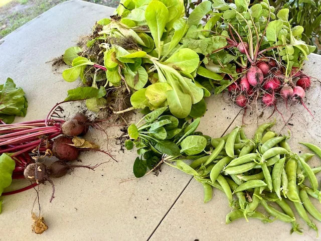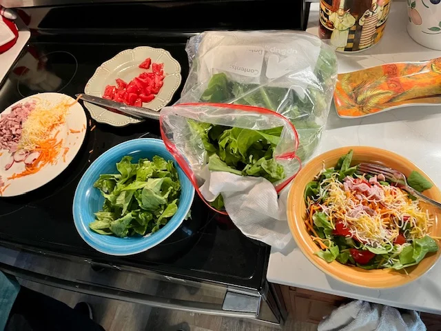 The big bag of lettuce was from my garden that I brought with me. I picked Romaine, Buttercrunch and baby Bibb lettuces. The spinach wasn’t ready.