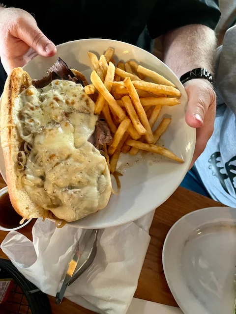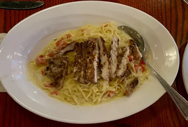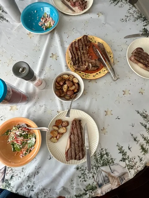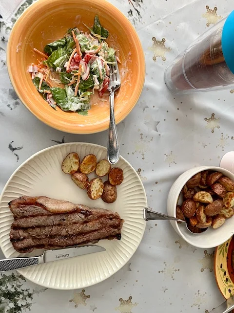 Dinner was a group effort tonight. I made roasted rosemary red potatoes. Robert grilled enormous steaks. Kristine made salads. It was all delicious and I couldn’t even eat 1/2 my steak or all my salad.