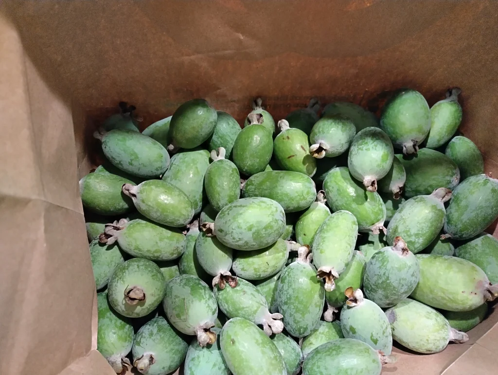 From South America. ",Feijoa", Brazilian nomination. We scoop them with a spoon or make juice. Tree is similar to a fig