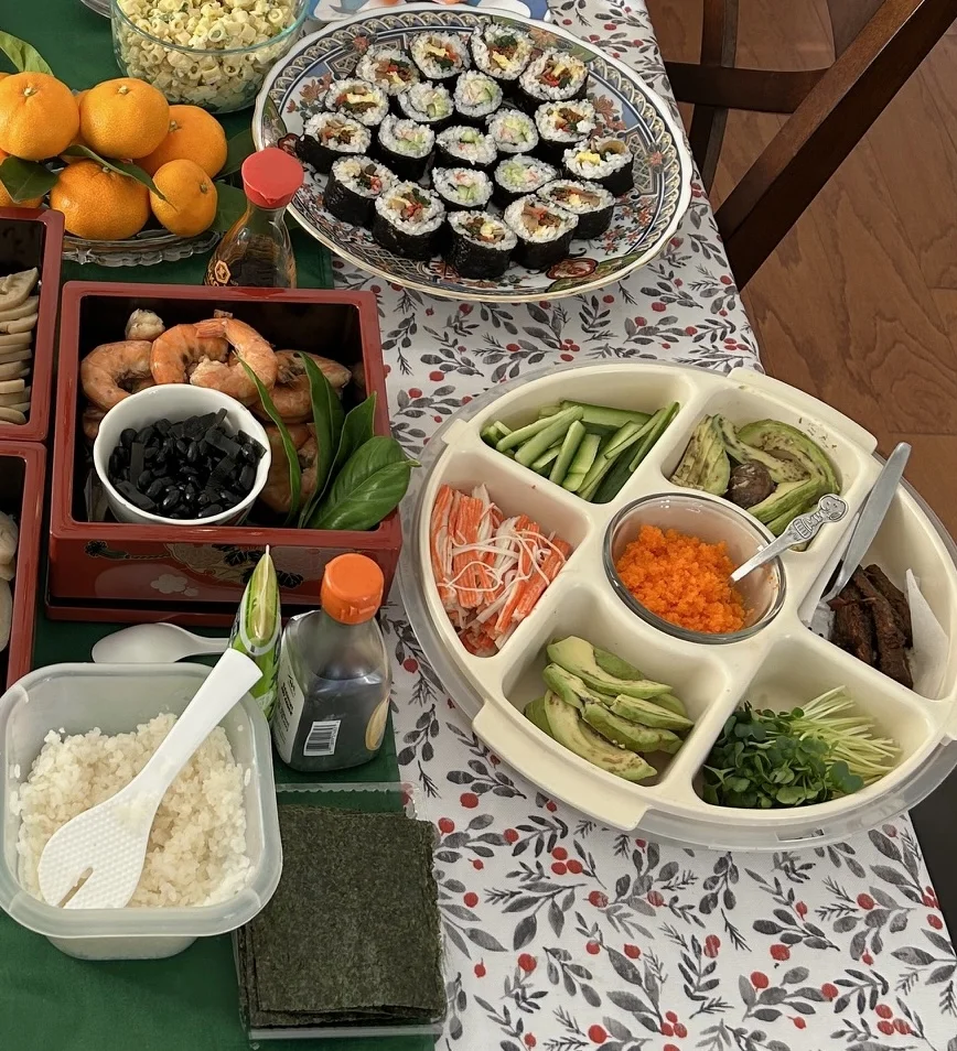 This was from my New Year’s Day this year that I posted back then. We made some rolls (California roll and makizushi) but we also put out some “roll your own” ingredients for do-it-yourself handrolls. In the foreground you can see a container of seasoned rice, and some squares of nori to the right of it. In the round partitioned server are the things you can choose from. Just spread a little rice on a nori square, put what you want on the rice, fold up and eat. 😋