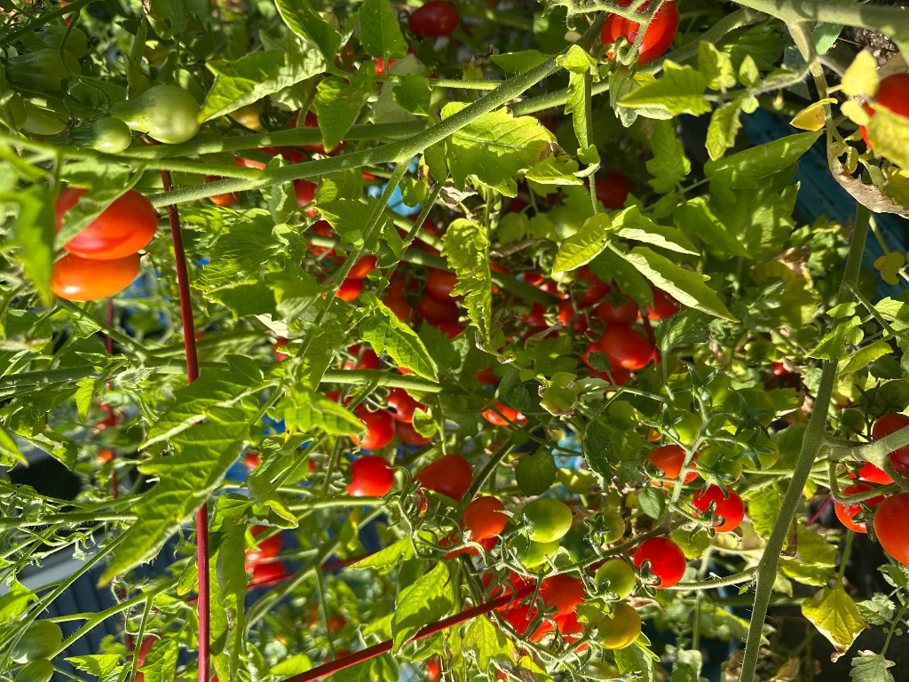 SUMMER TOMATO & GOAT CHEESE SALAD - fresh baby arugula with roasted onions and peppers, dried apricots, and crumbled goat cheese, topped with a light mint vinaigrette