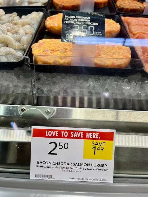 Ok so a weird item in the Publix seafood case. A burger with salmon, bacon and cheddar cheese. It gave me pause because I think Monterey Jack cheese would complement the salmon better.