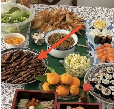 I saw these! LOL, I saw these when I was looking up the short ribs, and I don't think I ever did. MAYBE in a taco, but it would have to be a very long time ago for me not to remember. Honestly, that's not surprising, I don't eat much red meat at all. I'm probably eating more recently than I have in my whole life, And probably the thing I eat the least of period is ribs. Even pork ribs is a pretty rare thing. When we get the pork ribs, it's either BBQ/grilling (maybe long-term roasted in oven) and/or Char-Siu.Have you had Korean Kalbi (Galbi)? It is short ribs, cut flanken style, marinated and grilled. It was in that photo of my New Year’s foods. Here’s the photo, to which I added an arrow pointing to the Kalbi ribs. I cut them between the bones for ease of serving buffet-style.