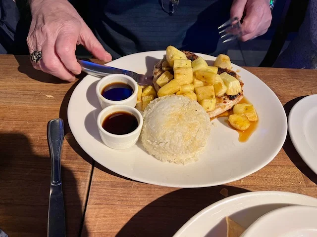 JKs Dad, the grumpy, “can never find anything to be happy about” guy, ordered the Maui Pineapple Chicken.