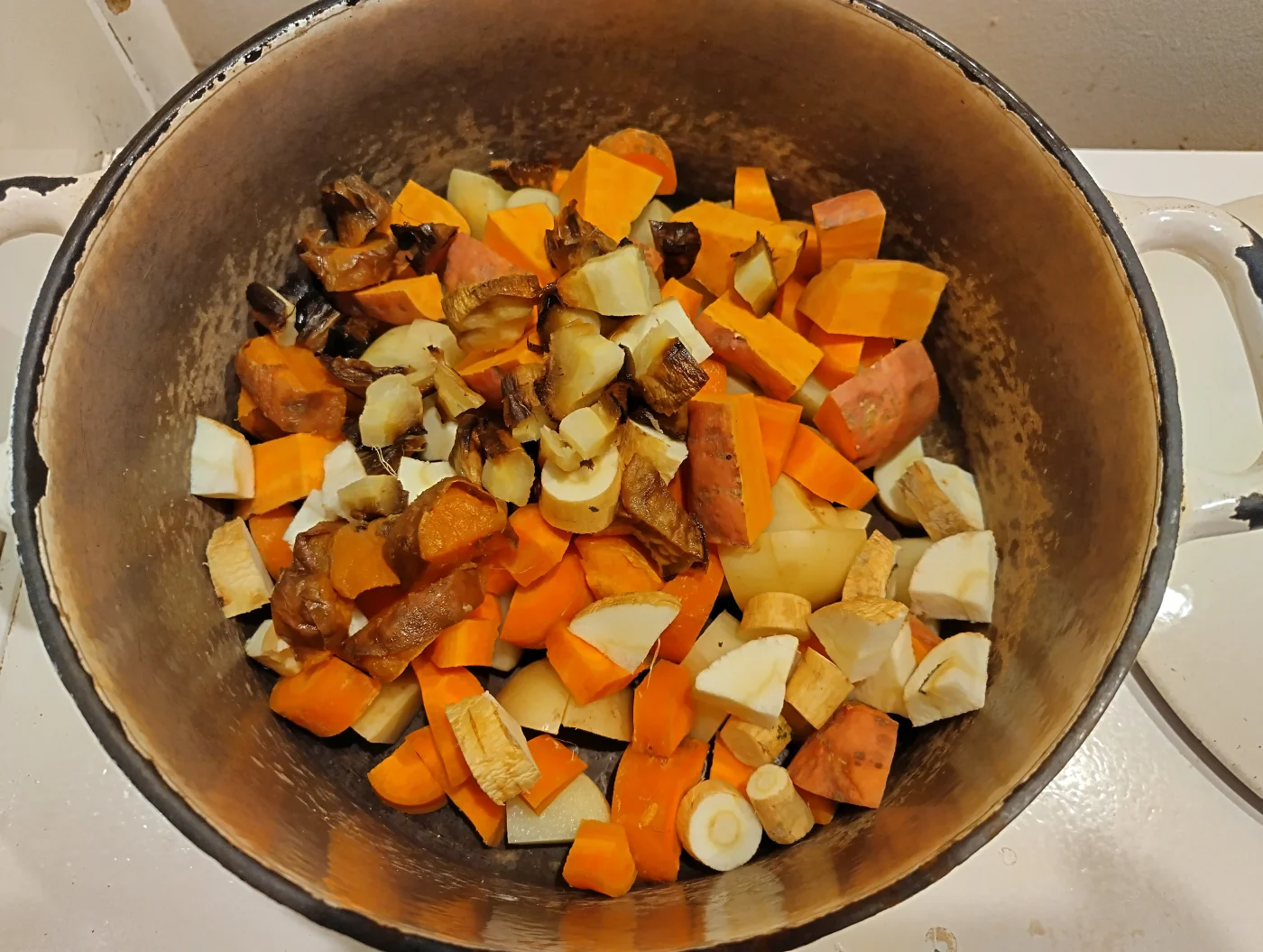 Potatoes, sweet potato, carrots, parsnip, and some leftover roast veg from the other day. No celery this time because we don't have any.