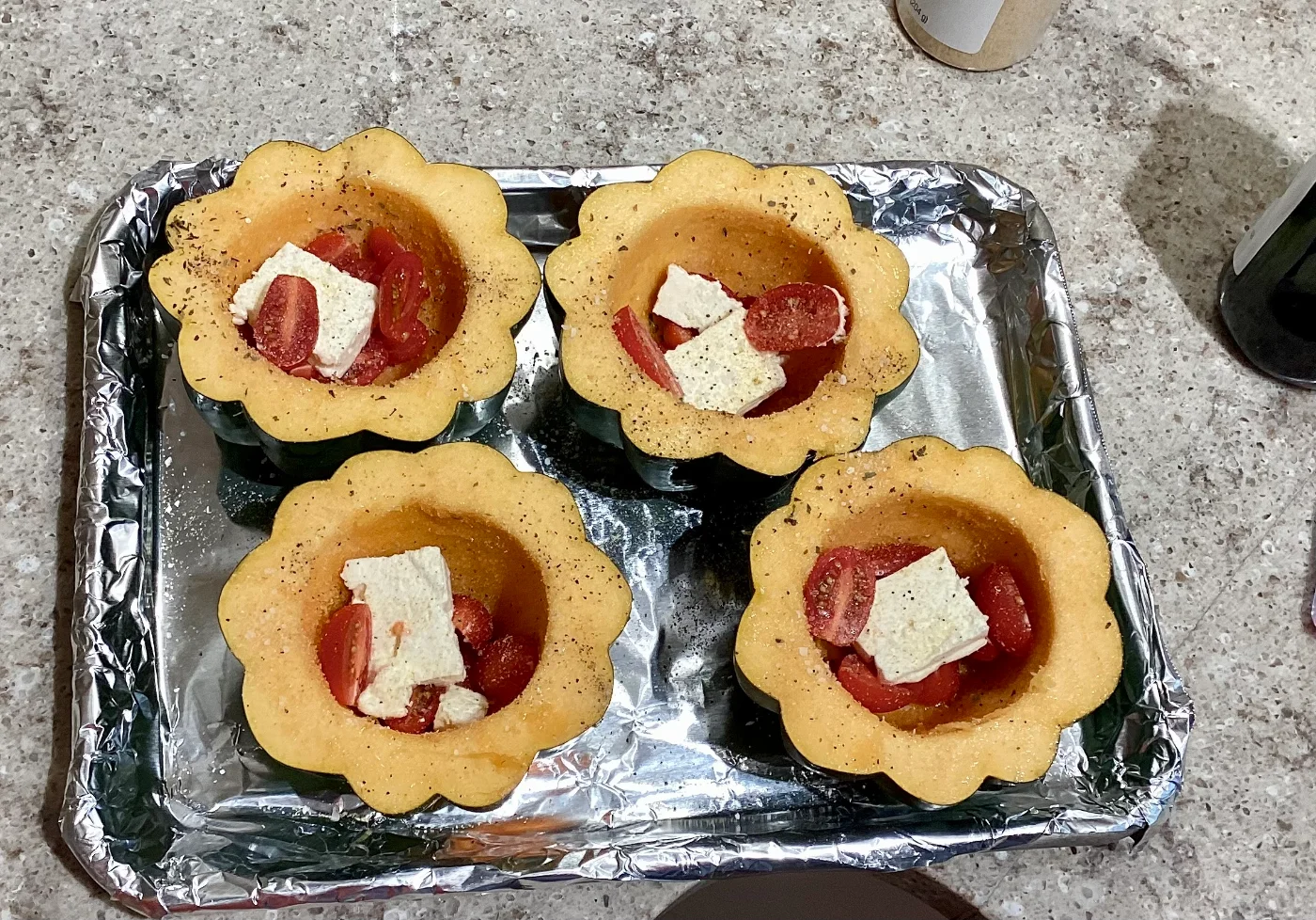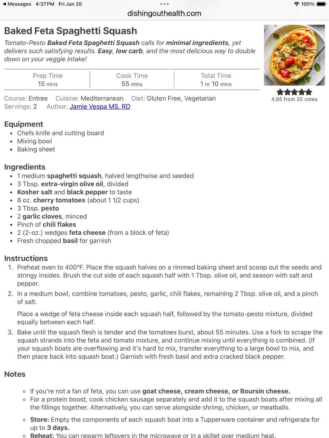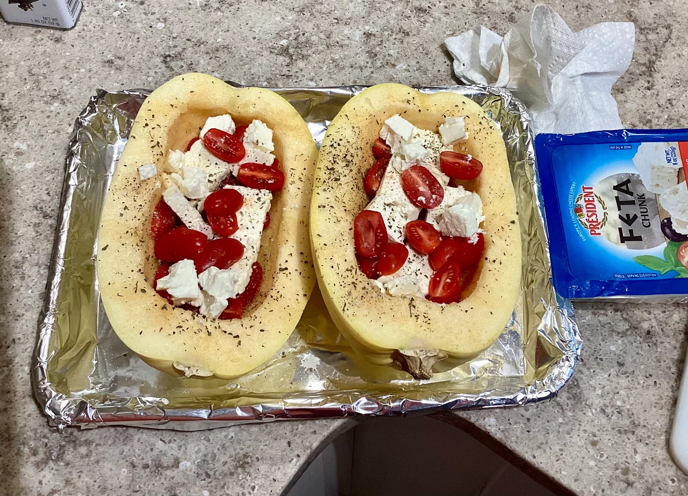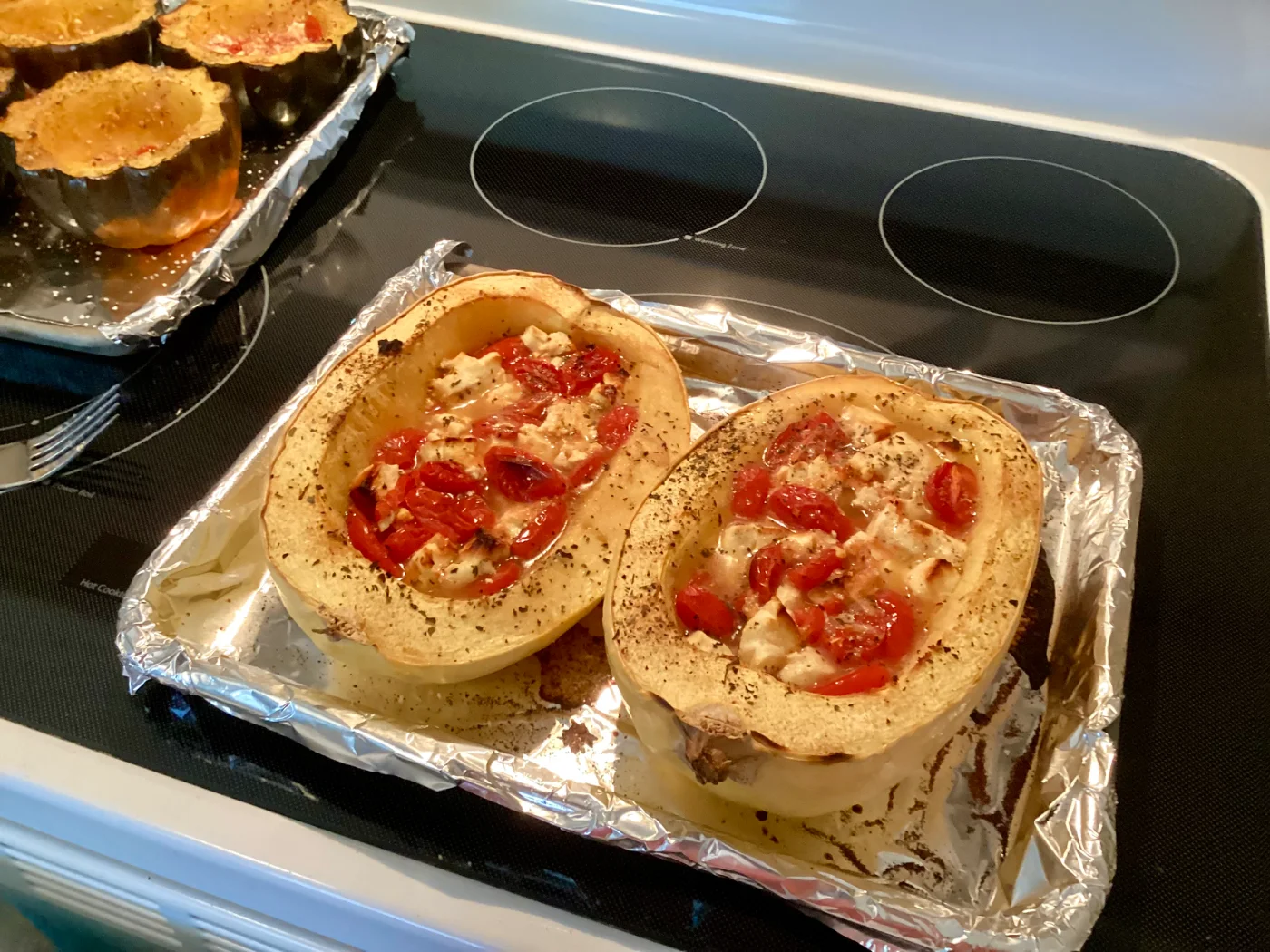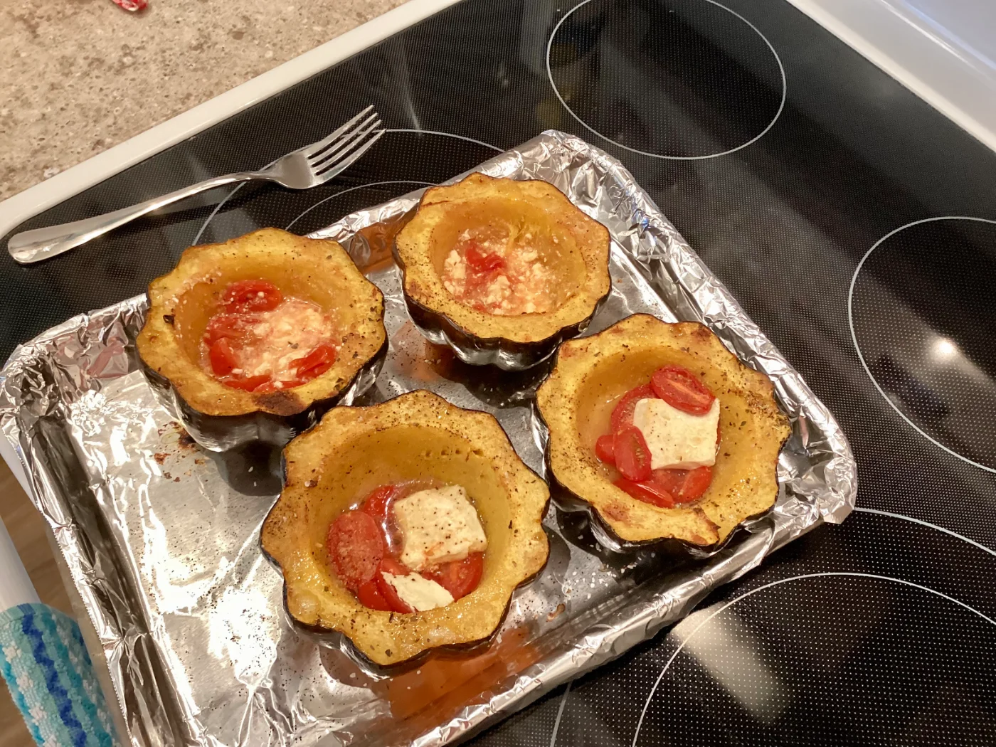 I made the spaghetti squash recipe my daughter taught me, minus the pesto. I used dry spices for simplicity. I had 2 acorn squash and did the same thing to them. I ate a half an acorn squash and it was tasty.