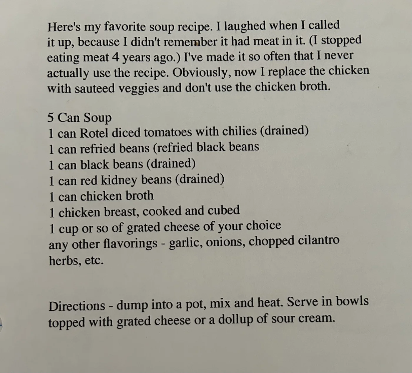 Found it. The top is her words, not mine (as I DO eat meat. 😋) The way she wrote it, it looks like the cheese goes into the soup, but I believe it’s just for topping after. At least, that’s what I thought. 🤔