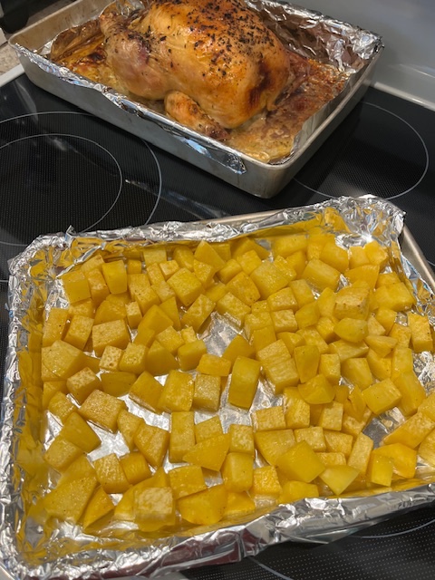 I peeled the carrots but probably won’t cook them. We’ll just snack on them. I cubed rutabaga and sweet potatoes. We have broccolini but only she eats it.