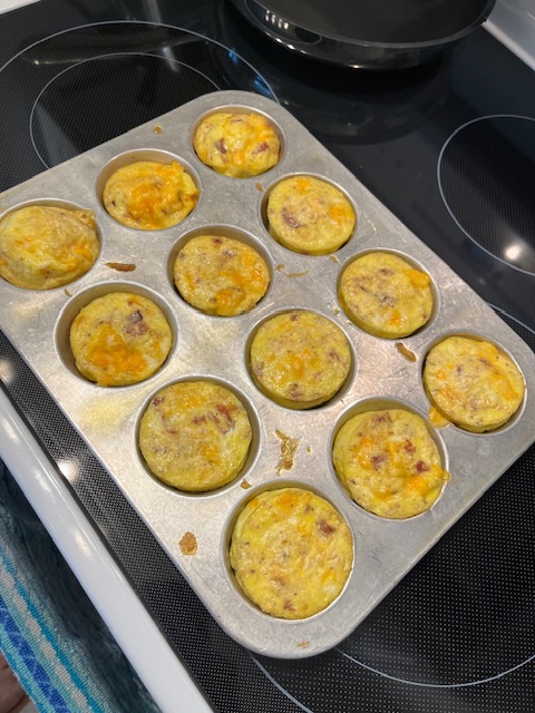 This morning I made egg cups with bacon and cheese. I used 10 large eggs, maybe 6 slices of cooked bacon chopped up and probably a cup of colby jack cheese. They puffed up in the oven then sunk down as a they cooled. They turned out really good. I had always used turkey sausage in the past. Sometimes we add spinach and tomato.