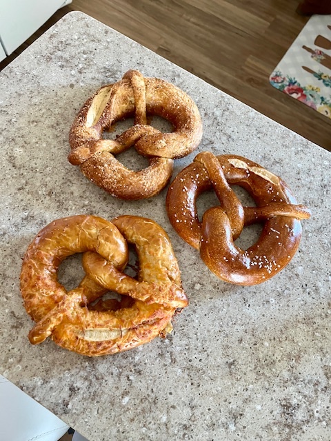 I bought 3 big pretzels (3/$12) that are not gluten free and 2 little cups of cheese dip. They had 6 flavors so I picked Salt, Four Cheese and Parmesan Herb (I think that was what it was called). They had a bacon cheese flavor. I can’t remember the other two. The herb was had a bit too much of something that was spicy. But I dipped it in cheese sauce and ate the entire thing! I put the other two in the freezer.