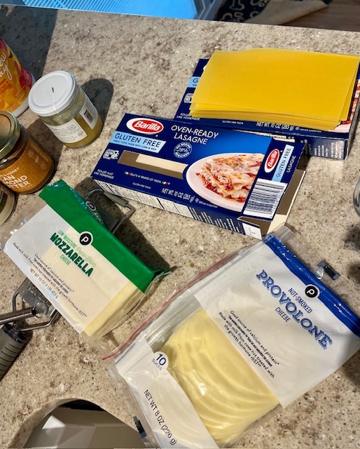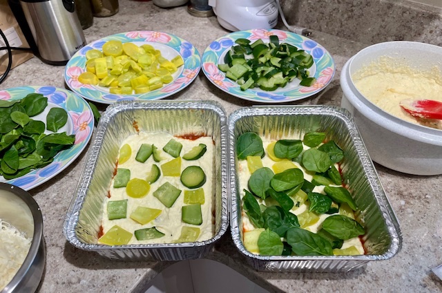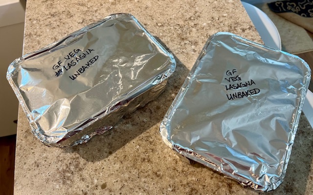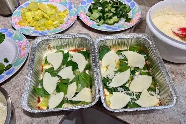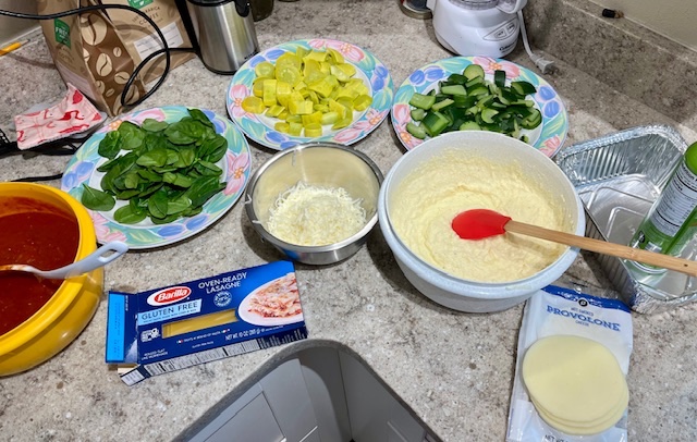 Lasagna Day today. I made 2 with ground turkey and 2 vegetarian. I baked one turkey dish for us. The other one went in the freezer for the people who cleaned up my yard after the hurricane. They are my daughter’s friends who live 45 min south of me. The husband is allergic to beef. The wife and the other lady are gluten free.