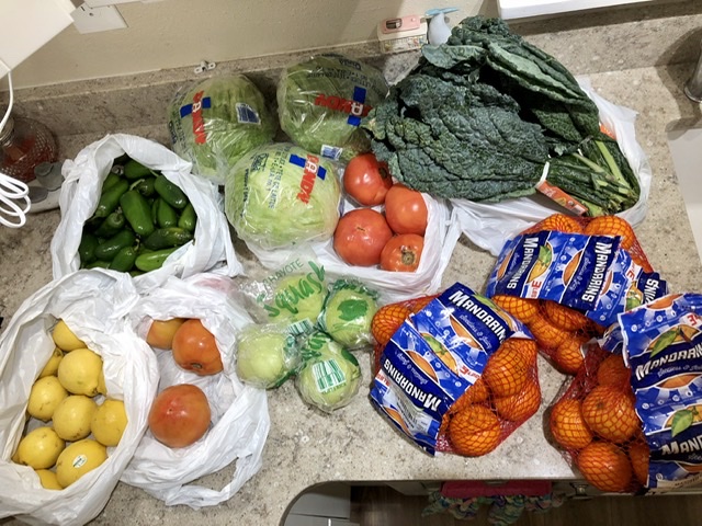 Veggies: tomatoes, cauliflower, jalapenos, zucchini, iceberg lettuce, kale, mandarin oranges, potatoes, chayote squash