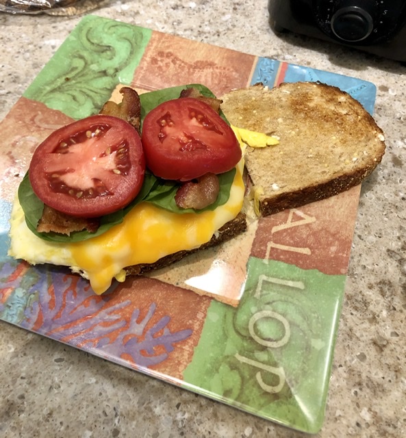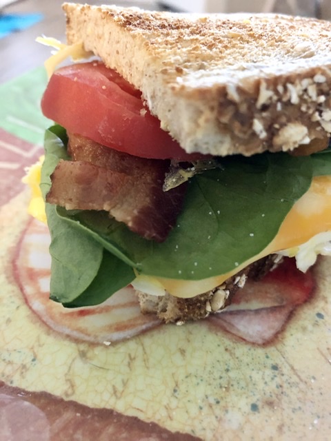Who needs Panera Bread?! Not me! Yummy egg sandwich for brunch. Toast, 2 eggs, cheese, bacon, spinach, tomato.