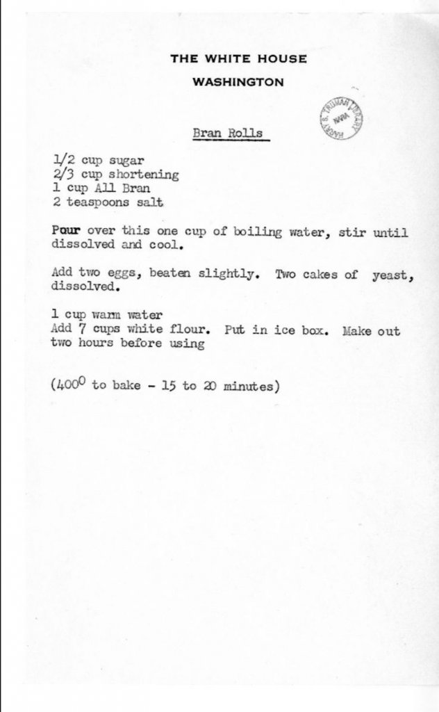 Recipe for Bran Rolls, from the Bess W. Truman Papers. National Archives Identifier 139308721 or National Archives Identifier 139308778