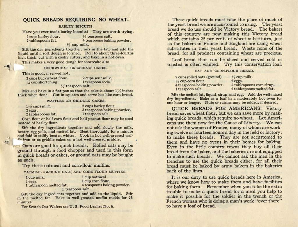 Recipe for Oat and Corn Flour Bread, from the Wheatless Breads and Cakes, Save the Wheat for Victory, United States Food Leaflet No. 20, 1918. National Archives Identifier 18497463 (page 2)