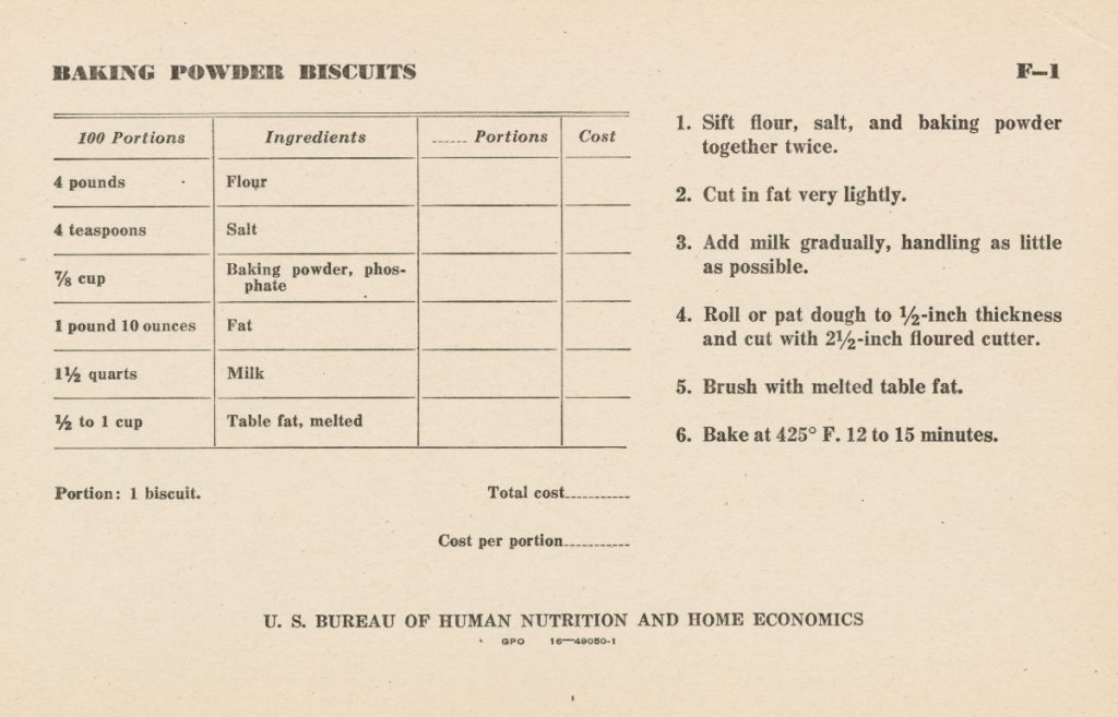 Baking Powder Biscuits, from School Lunch Recipes for 100, 9/1946. National Archives Identifier 5711542 (page 60)