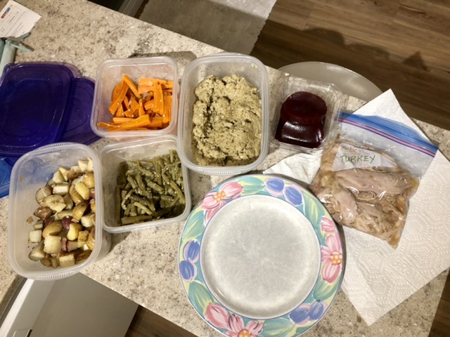 I fixed a big veggie plate for my youngest to pick up out front. I had bought her some GF bread and non dairy butter. I sent her home with 70% alcohol wipes, paper plates, napkins and paper towels to minimize the use of the kitchen. I also had an extra 5 pack of disposable masks and a partial box of medical gloves. Now she can clean the doorknobs, fridge door, counters, etc.