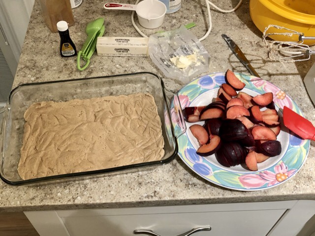 It called for 10 Italian plums. I have regular plums. I used 4-5 of them. Hopefully it will turn out tasty. Youngest will stop by on her way to work to pick up some. I’ll take some to the beach for my oldest.
