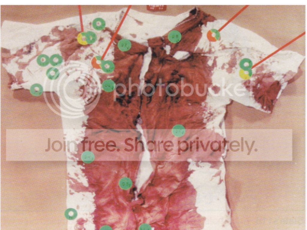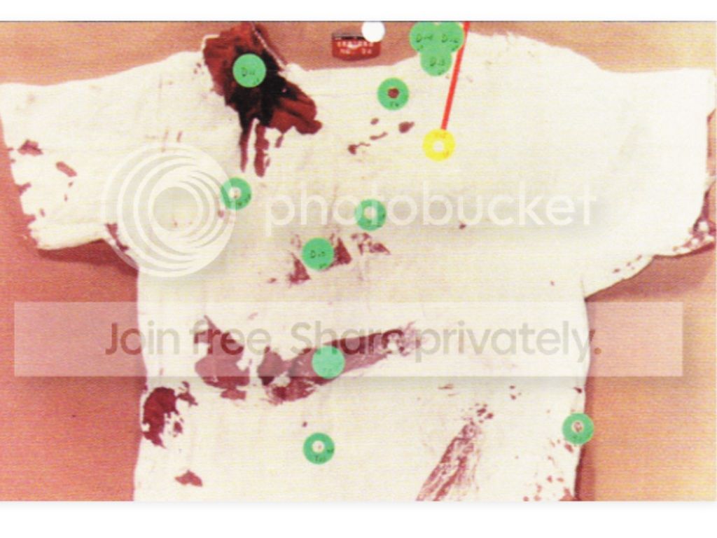 Look at the shirt. On the left neck area side of the shirt there is evidence blood pooled in that direction. The cut to her throat was on the right. Gravitationally, the blood would only pool to that side if, at some point, she were laying on her left side. None of the responders ever testified she laid down at the scene. The only logical conclusion is that she was laying on her left side which would expose her back to the attack on Devon who was within feet of where she was laying.