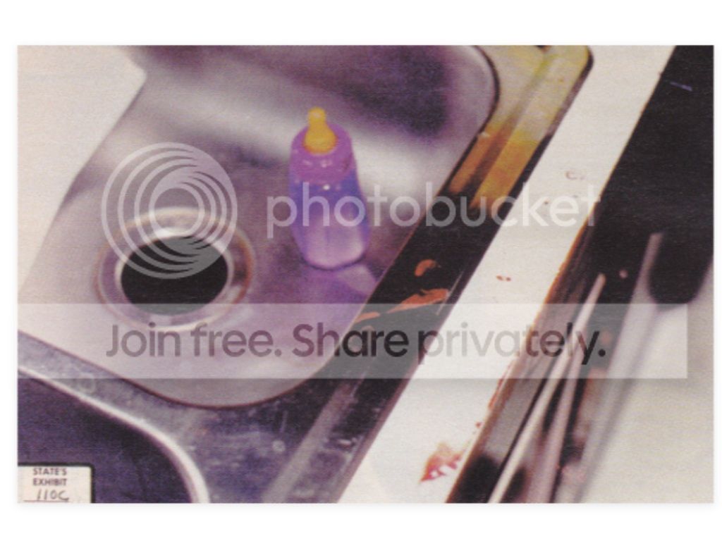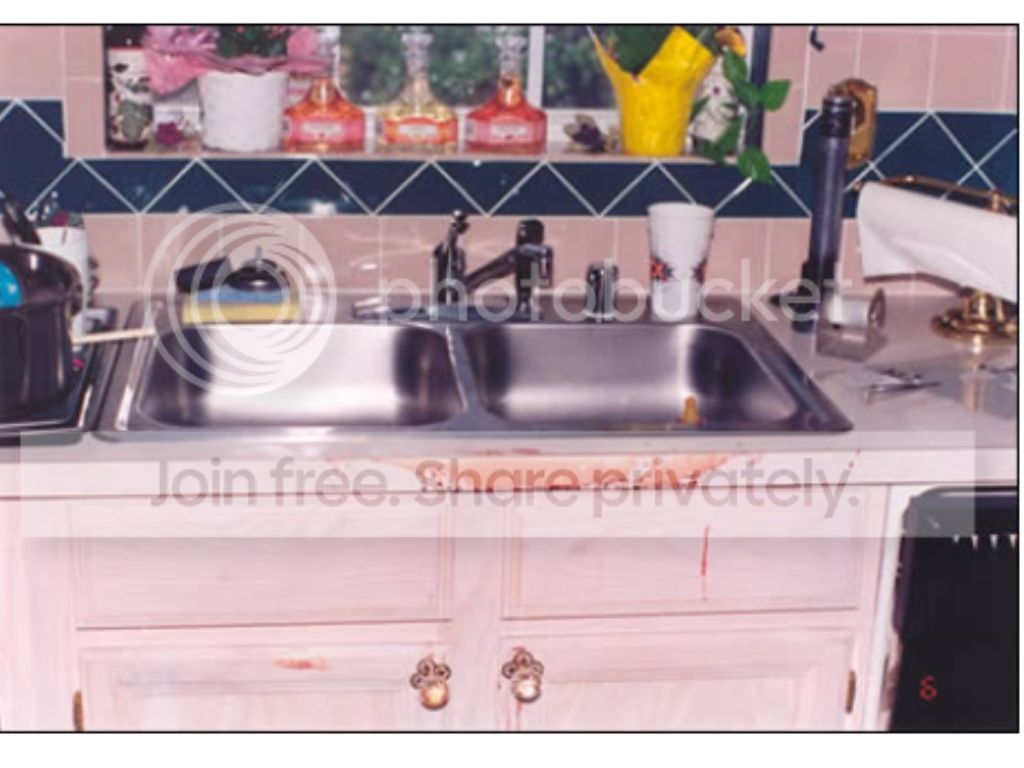 What part of the sink appears clean? I know that sounds like a snide question. It's not intended to be. The sink does not appear to be cleaned in any way. Two sponges were collected. No blood on either. The cleaners underneath the sink were inspected. Again, no blood. If I am to believe Darlie cut herself at the sink and then cleaned it up, I have to also believe she did it with nothing but water and her hands. The only thing the sink looks like is one that had blood in it as well as water. The presence of nothing more than water doesn't indicate a clean up job to me.