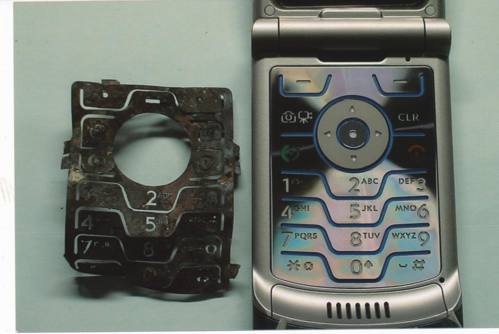 We can play "Spot the Difference" with this photo. This is from the FBI, Curtis Thomas who is an Electronic Engineer with the FBI testified and said they used this exemplar (on the right) to identify the phone as a Motorola Razr V3. They are both Razr V3's, but there are different models, the burnt one I believe is a Razr V3i. The top buttons are different, and the top of the plate was different. I had read that the phones didn't match before, but now I "see" it. I searched last night and was unable to find any additional information about what model of phone TH had.